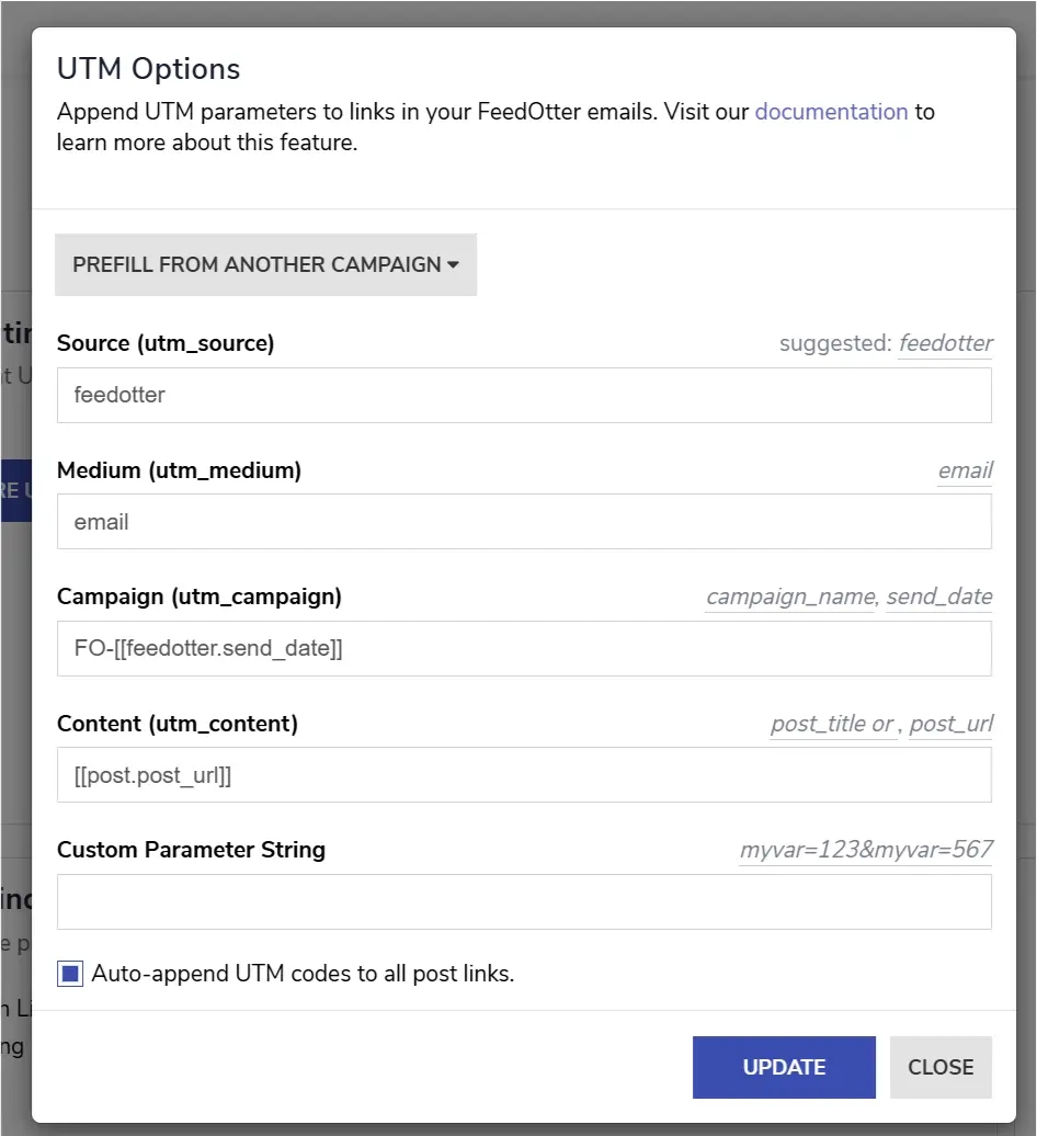 Here you can update the settings as need be or turn off the feature entirely. To turn the feature off, deselect “Auto-append UTM codes to all post links.”