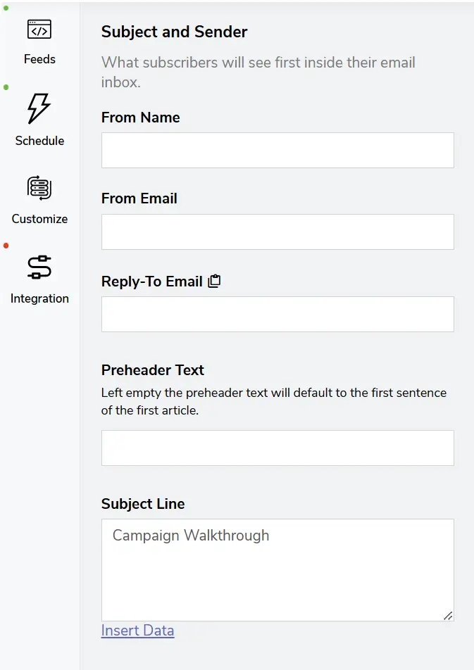 To insert dynamic FeedOtter content into your subject line, select Insert Data. Choose the item you’d like incorporated in your subject line, and you can refresh the preview below to see an example of what your subject will look like.