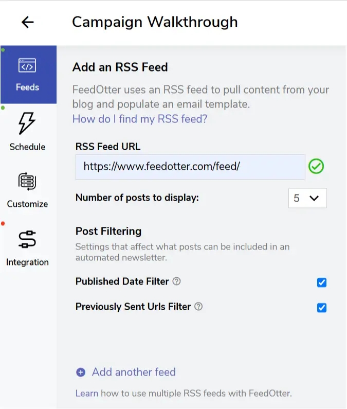 Here, we also told FeedOtter to display 5 posts with each email send. This means FeedOtter will only send up to 5 new posts in your email.